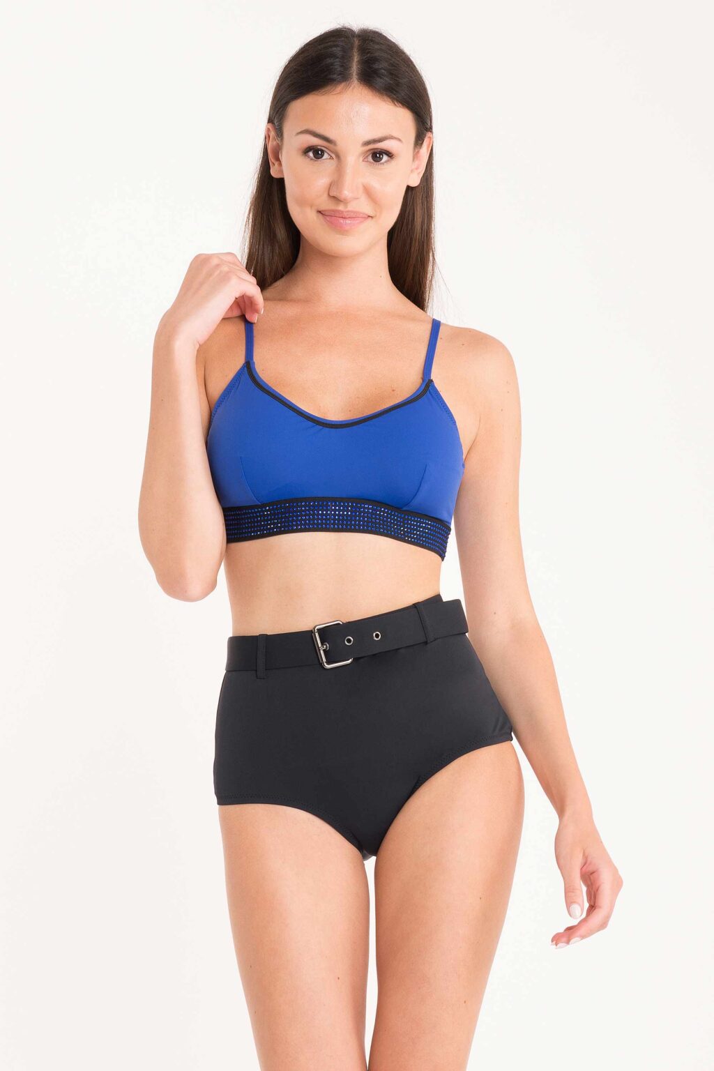 Bikini bicolore con top bralette, coppe removibili, spalline regolabili e allacciatura dietro la schiena, arricchito da applicazioni in strass. Lo slip coordinato a tinta unita è a vita alta con un cinturino regolabile.