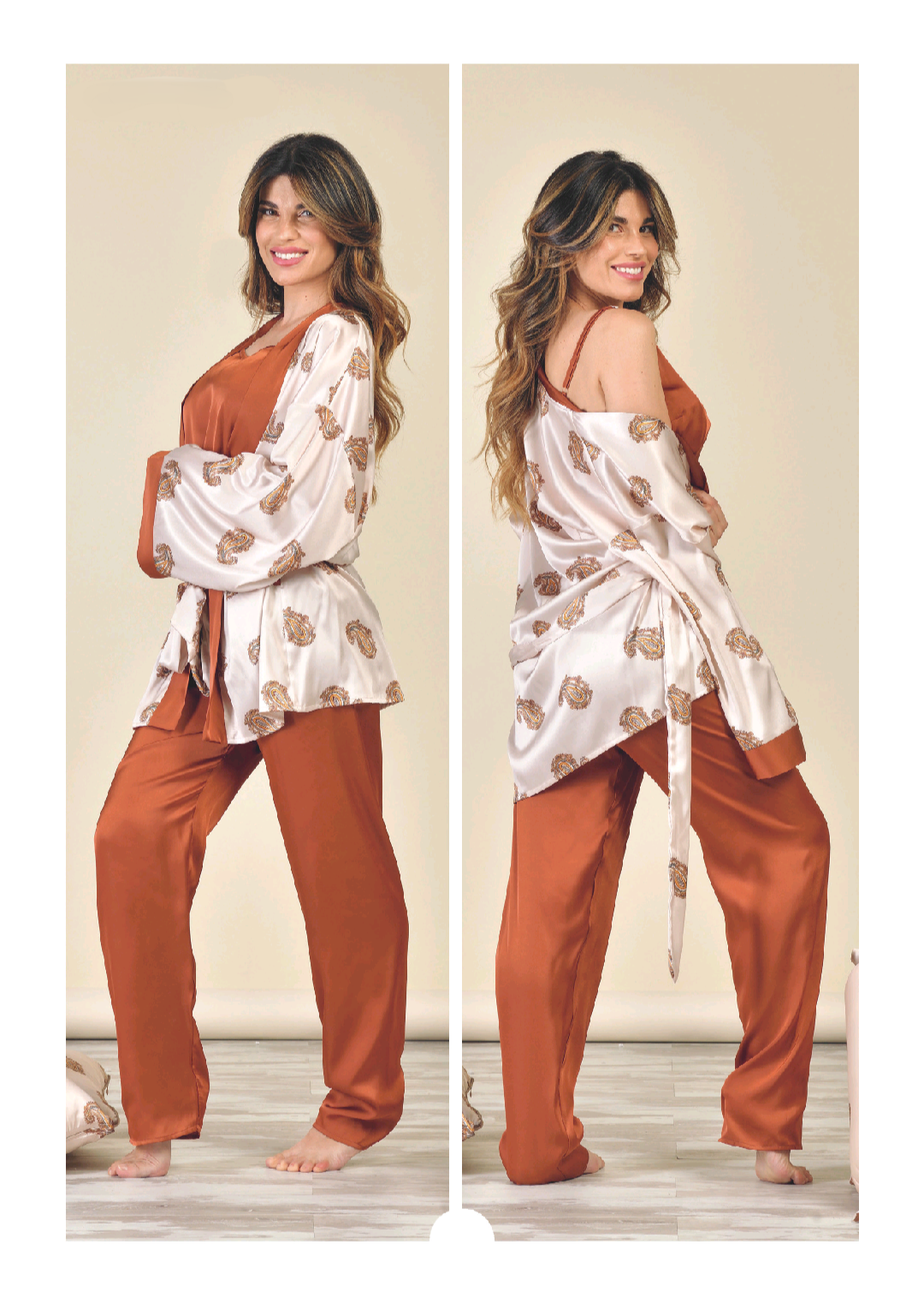 Composè donna, formato da uno stupendo pigiama colore bronzo e completato da un kimono panna fuori dal normale con un fantastico disegno che si coordina perfettamente, capo di estrema qualità dato dal suo tessuto in poli seta, prodotto per chi vede al di là del solito pigiama da casa