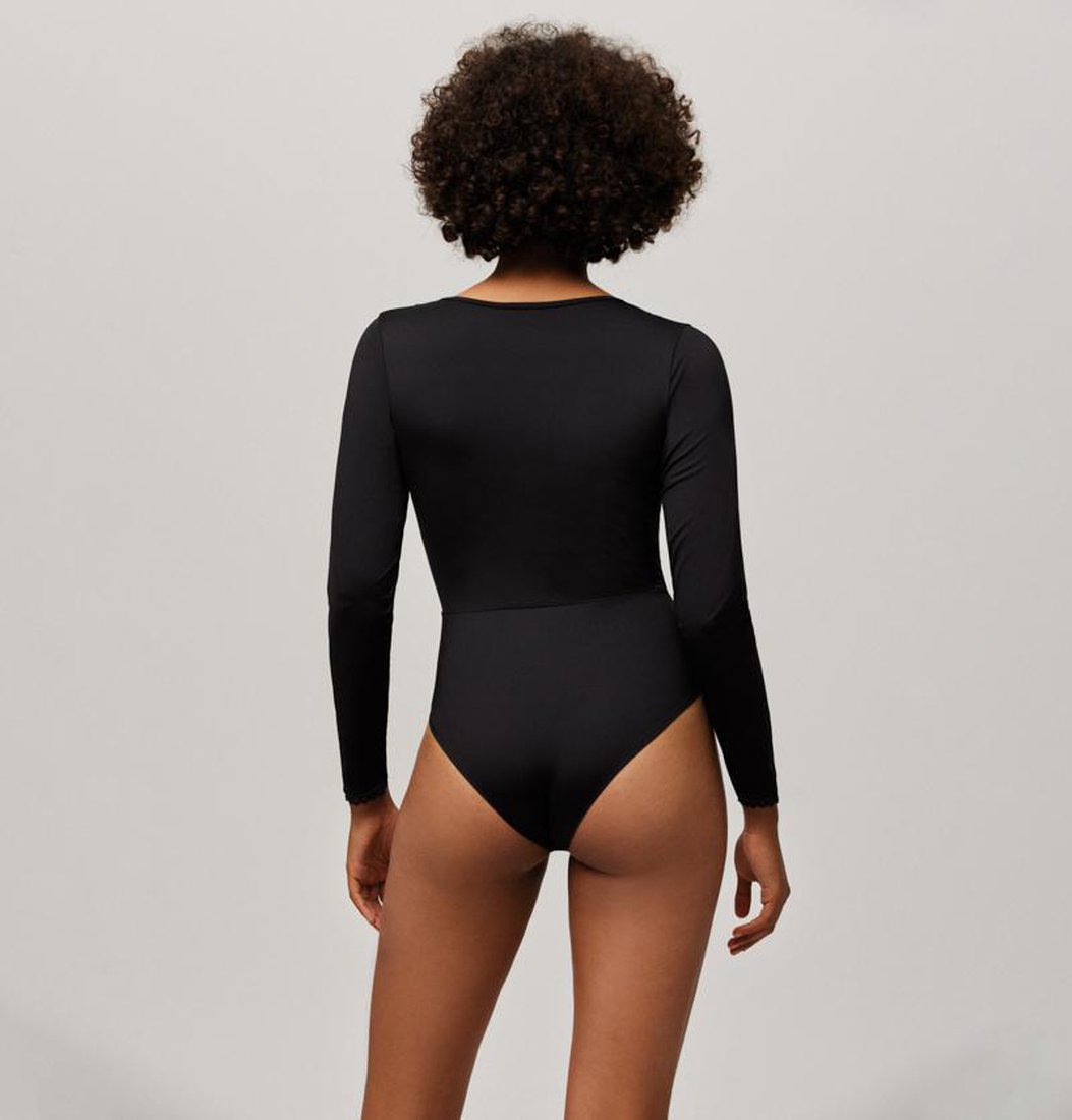 Top a maniche lunghe in pizzo floreale. Capo femminile e sensuale. Tessuto elastico in microfibra, morbido e altamente adattabile. Il suo design delicato decorato nella scollatura e nelle maniche, unisce qualità ed eleganza.