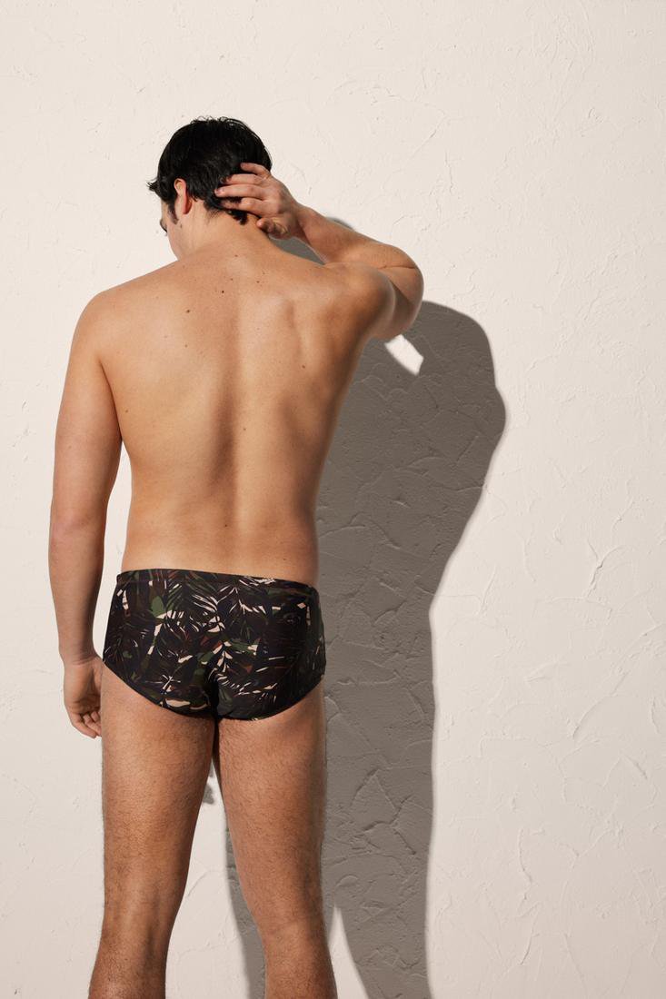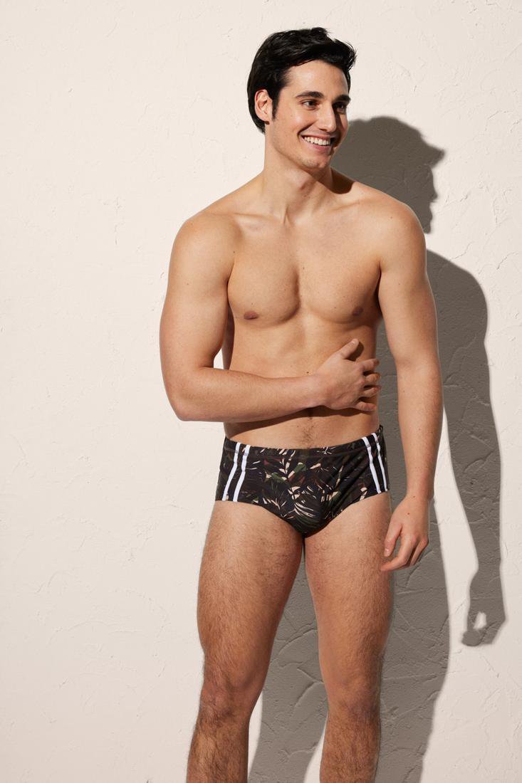 Slip YSABEL MORA da bagno sportivo da uomo. Stampa di foglie tropicali.