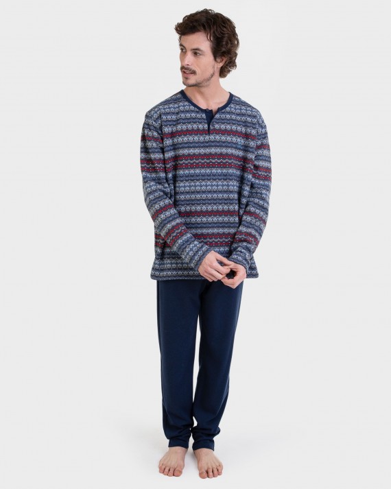 Pigiama da uomo MASSANA composto da maglia a maniche lunghe e girocollo. Pantaloni lunghi con vita e polsini regolabili, il tessuto è un punto milano soft, morbido e caldo con un vestibilità eccellente